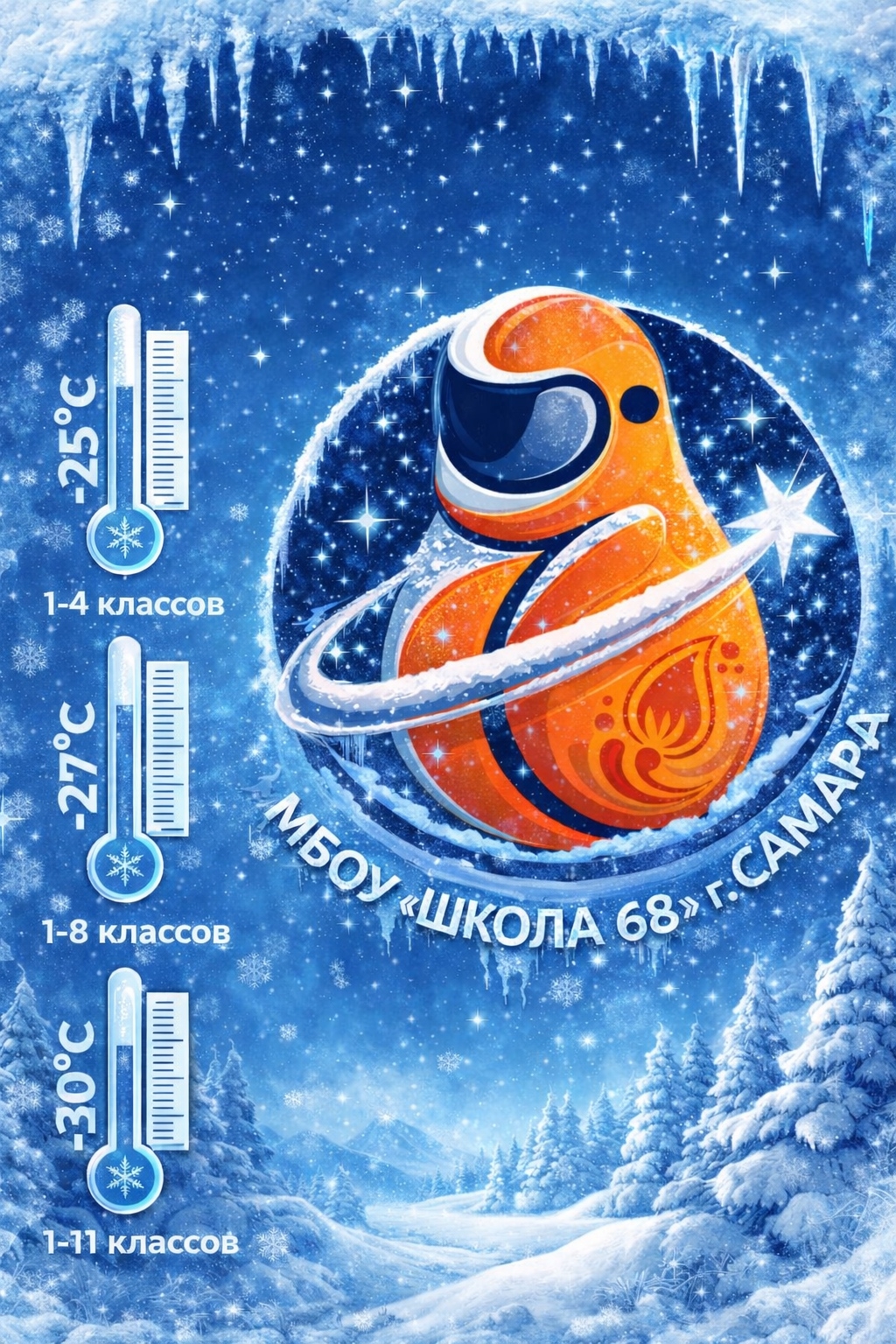 Уважаемые коллеги, родители и обучающиеся! По данным синоптиков, 26 января 2026 года в Самарской области ожидаются сильные морозы, местами температура может опускаться до -32°C. Просим вас отнестись к этой информации со всей серьезностью: 1. Позаботьтесь о здоровье детей: максимально ограничьте…